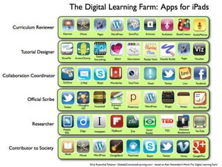 The document discusses using iPads as tools for personalization, collaboration, personal learning, visualization, organization, annotation, reading fluency, communication, creativity, storytelling, photography, and more in early elementary education. Specific apps like Book Creator, AudioBoo, Notability, and Dragon Dictation are mentioned. The iPads can help develop skills like those in Bloom's Taxonomy and Gardner's Multiple Intelligences as well as 21st century literacies.