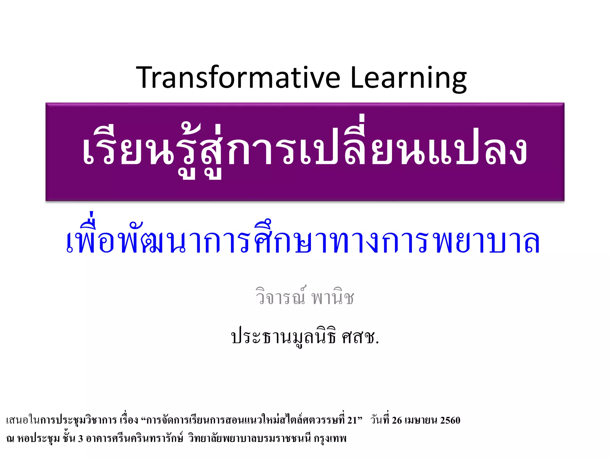 Transformative Learning : การเรียนรู้สู่การเปลี่ยนแปลงเพื่อพัฒนาการศึกษาทางการพยาบาล” บรรยายโดย ศ.นพ.วิจารณ์ พานิช ในการประชุมวิชาการ เรื่อง “การจัดการเรียนการสอนแนวใหม่สไตล์ศตวรรษที่ 21” ระหว่างวันที่ 26 – 27 เมษายน 2560 จัดโดยวิทยาลัยพยาบาลบรมราชชนนีกรุงเทพ ร่วมกับ สมาคมศิษย์วิทยาลัยพยาบาลบรมราชชนนี กรุงเทพ