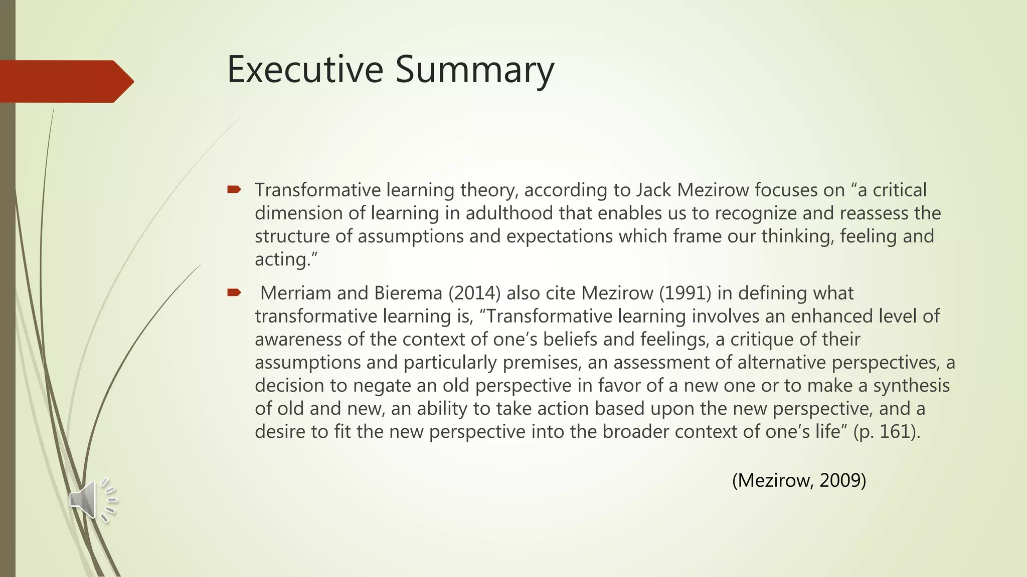 Transformative learning theory focuses on recognizing and reassessing assumptions through critical reflection. It involves enhanced awareness of beliefs/feelings, critiquing assumptions, considering alternatives, and taking informed action. Adults learn through action learning, experiential learning, project-based learning, and self-directed learning. Transformative learning occurs through life experiences combined with education and critical thinking. Mezirow identified 10 phases of transformative learning including a disorienting dilemma, self-examination, critical assessment of assumptions, recognition of issues, exploration of options, planning a course of action, and reintegration into life with a new perspective.