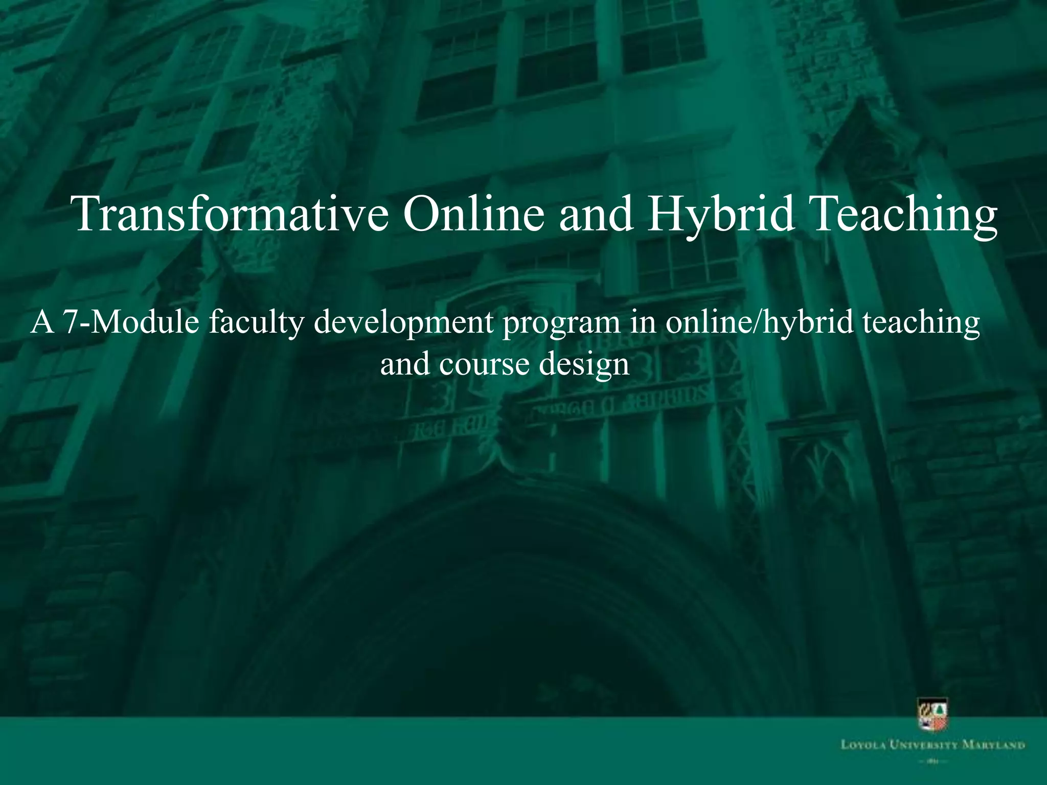 The 7-module faculty development program focuses on designing coherent and integrated online/hybrid courses. It prepares faculty to effectively use technology to foster student interaction and engagement. The modules cover foundations of online/hybrid teaching, asynchronous and synchronous strategies, creating presentations/podcasts, and integrating online resources. Each module includes readings, videos, reflections, portfolio entries, and access to technology tutorials. The program is grounded in community of inquiry and Ignatian teaching approaches and integrates Quality Matters standards for online course design.