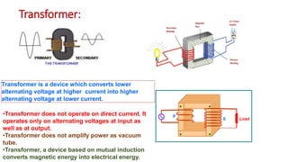A transformer is a device that converts alternating voltages from one level to another. It works on the principle of mutual induction between two coils linked by a magnetic field. A step-up transformer increases voltage and decreases current, while a step-down transformer decreases voltage and increases current. Real transformers are not 100% efficient due to energy losses from copper windings, flux leakage, hysteresis in the iron core, and eddy currents. However, transformers remain essential for power transmission and applications requiring different voltage levels.