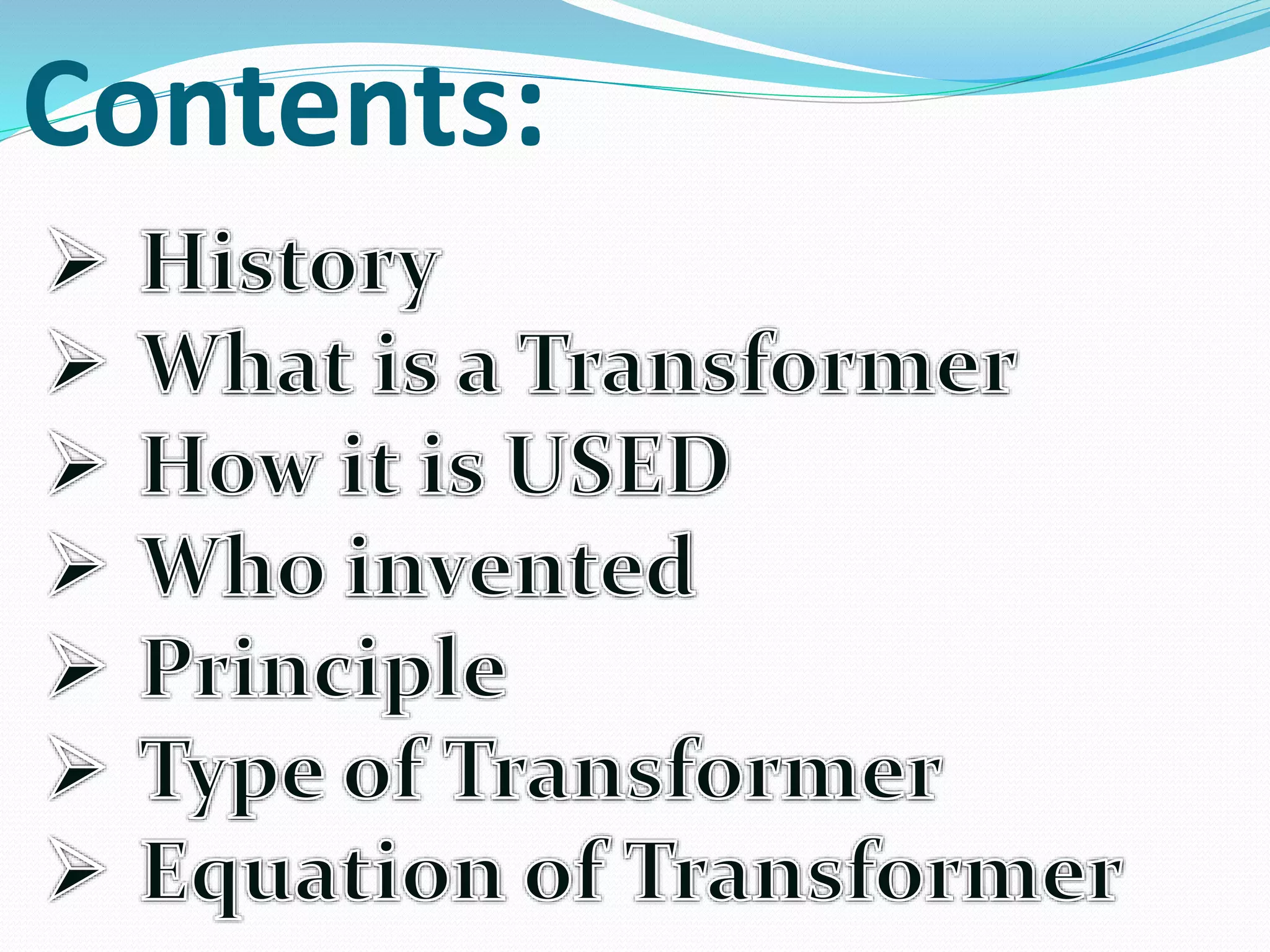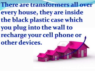 A transformer transfers electrical energy between two circuits through electromagnetic induction. It works by using a primary coil to produce a varying magnetic field that induces a voltage in a secondary coil. This allows transformers to increase or decrease voltage levels in an electrical circuit. The number of turns in each coil and the ratio of their turns determines the relationship between the voltages in the primary and secondary circuits. Transformers are commonly used to increase voltage for power transmission over long distances and decrease voltage for safe use in electronic devices.