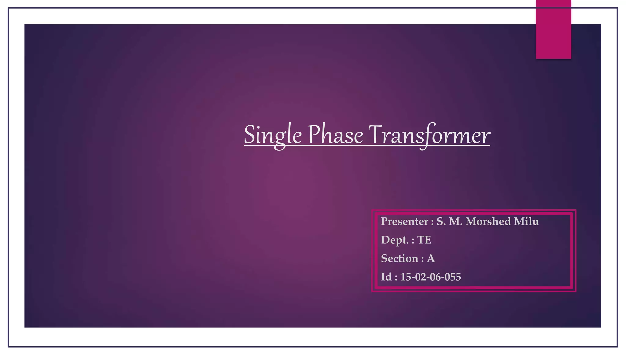 A single phase transformer works by electromagnetic induction to transfer electrical energy from one circuit to another without a direct connection. It uses a primary coil and secondary coil wound around an iron core to induce a voltage in the secondary coil from the primary coil's magnetic field. Transformers can be used to step up or step down voltages depending on whether the secondary coil has more or fewer turns than the primary coil. They allow efficient transmission of power over long distances by increasing voltage to reduce current and transmission losses.