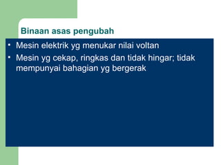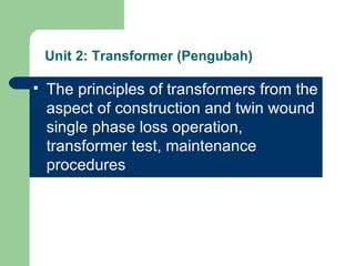 Dokumen ini memberikan ringkasan tentang prinsip kerja transformer secara umum, termasuk konstruksinya, operasinya, pengujian, dan pemeliharaannya. Juga dijelaskan cara menghitung voltan primer dan sekunder, arus, daya, efisiensi, dan jenis-jenis kehilangan daya pada transformer.
