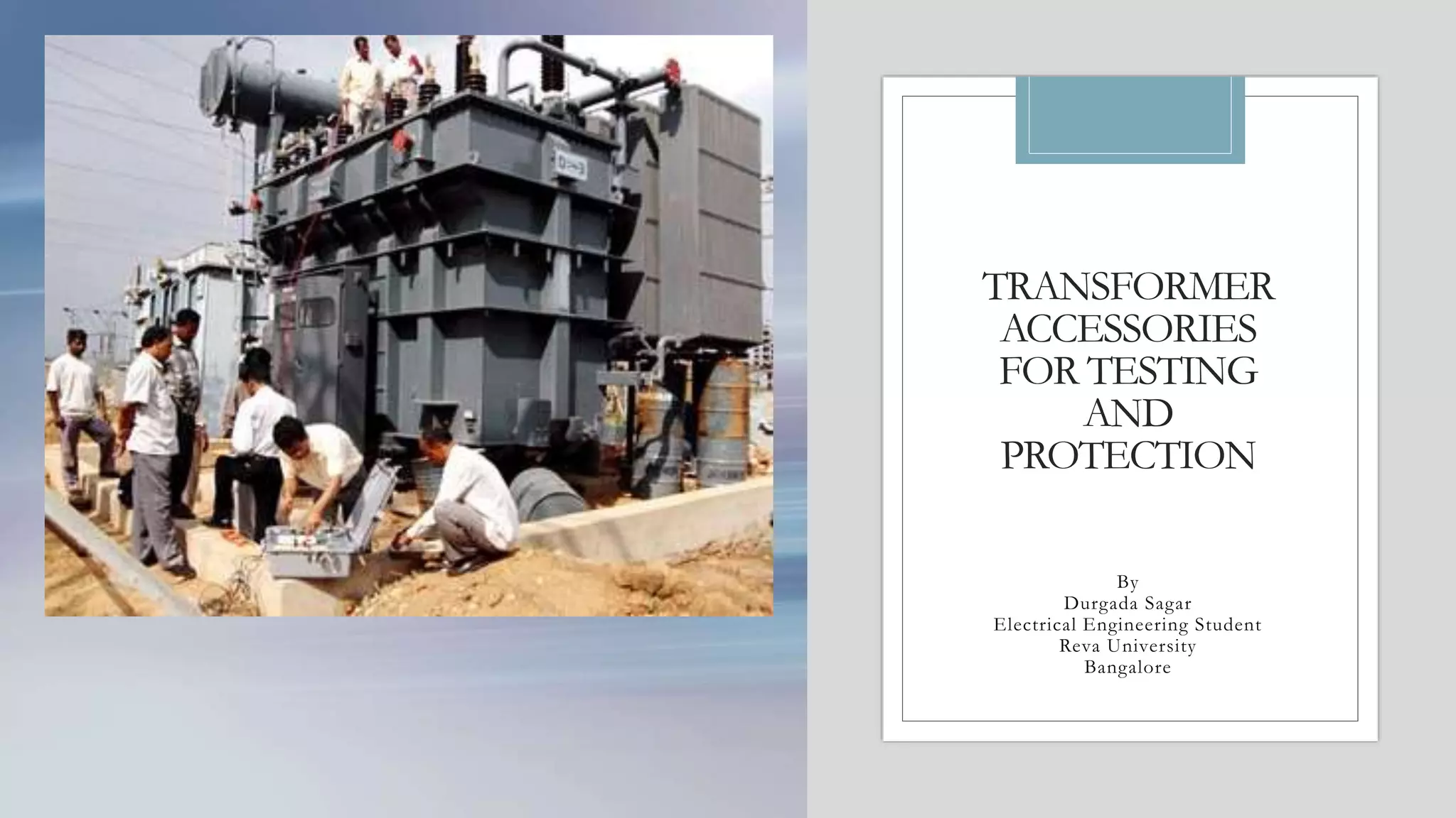 The document provides an overview of various accessories and devices used in oil-filled transformers for testing and protection, including gauges, increased cooling options, protective devices like surge arresters, and monitoring equipment. Key devices highlighted include liquid temperature gauges, pressure relief devices, and current transformers, each with specific functions to ensure transformer safety and efficiency. Additionally, customer-specified accessories and their importance in maintaining transformer operation and preventing faults are discussed.
