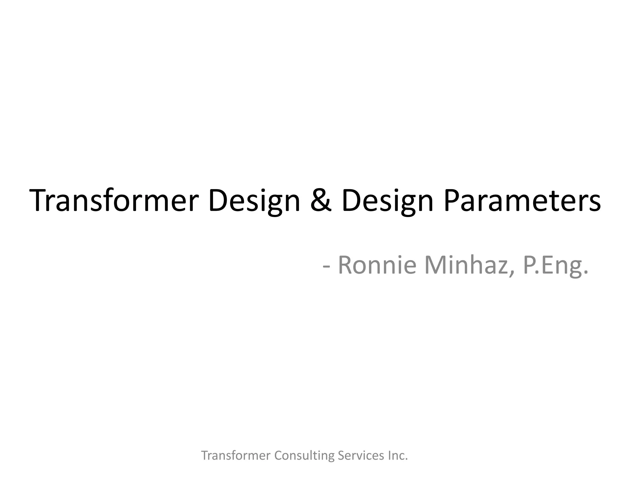 This document discusses transformer design and design parameters. It covers topics such as transformer ratings, core design, insulation coordination, voltages, impedance, forces, losses, temperature limits, and cooling. Standards from organizations like IEEE, ANSI, and NEMA are also referenced. Transformer design involves selecting appropriate ratings and parameters to meet requirements while considering factors like performance, reliability, insulation, cooling, and costs.