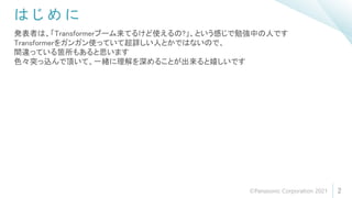 社内勉強会で発表した画像認識におけるTransformerの研究動向についてまとめた資料です。社のサイト(https://tech-ai.panasonic.com/jp/)にて、ブログ版(https://tech-ai.panasonic.com/jp/blog_page.html?id=20211022)も公開しています。 従来版(https://www.slideshare.net/kuz44ma69/transformer-in)で資料が一部抜けていたので追加しました