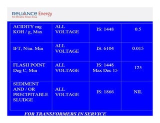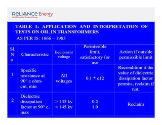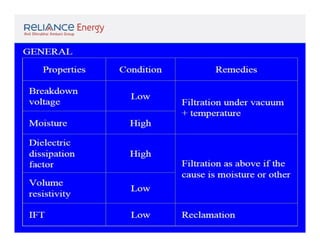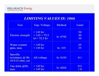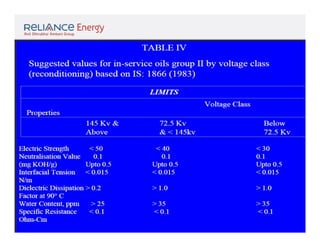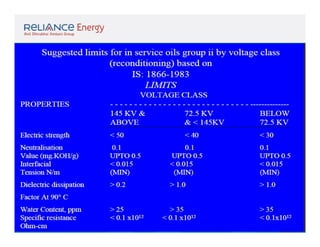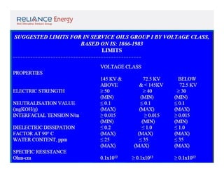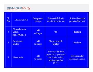 This document discusses maintenance schedules and strategies for electrical substation equipment like power transformers and distribution transformers. It provides daily, monthly, quarterly, half-yearly, and annual maintenance tasks for checking equipment operation and performance. Key tasks include checking oil levels, insulation resistance, dissolved gases in oil, and cleaning/replacing oil filters. The document also summarizes common equipment defects like leaks, loose connections, and winding issues; and stresses on equipment from electrical, thermal, mechanical, and environmental factors that cause deterioration over time.