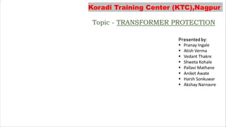 The document provides an overview of transformers, including their types, components, construction, and protection mechanisms. It details step-up and step-down transformers, their main parts, and the importance of transformer oil and insulation. Additionally, it outlines various transformer protection strategies such as overheating, overcurrent, and earth fault protections, along with the role of circuit breakers and lightning arresters.