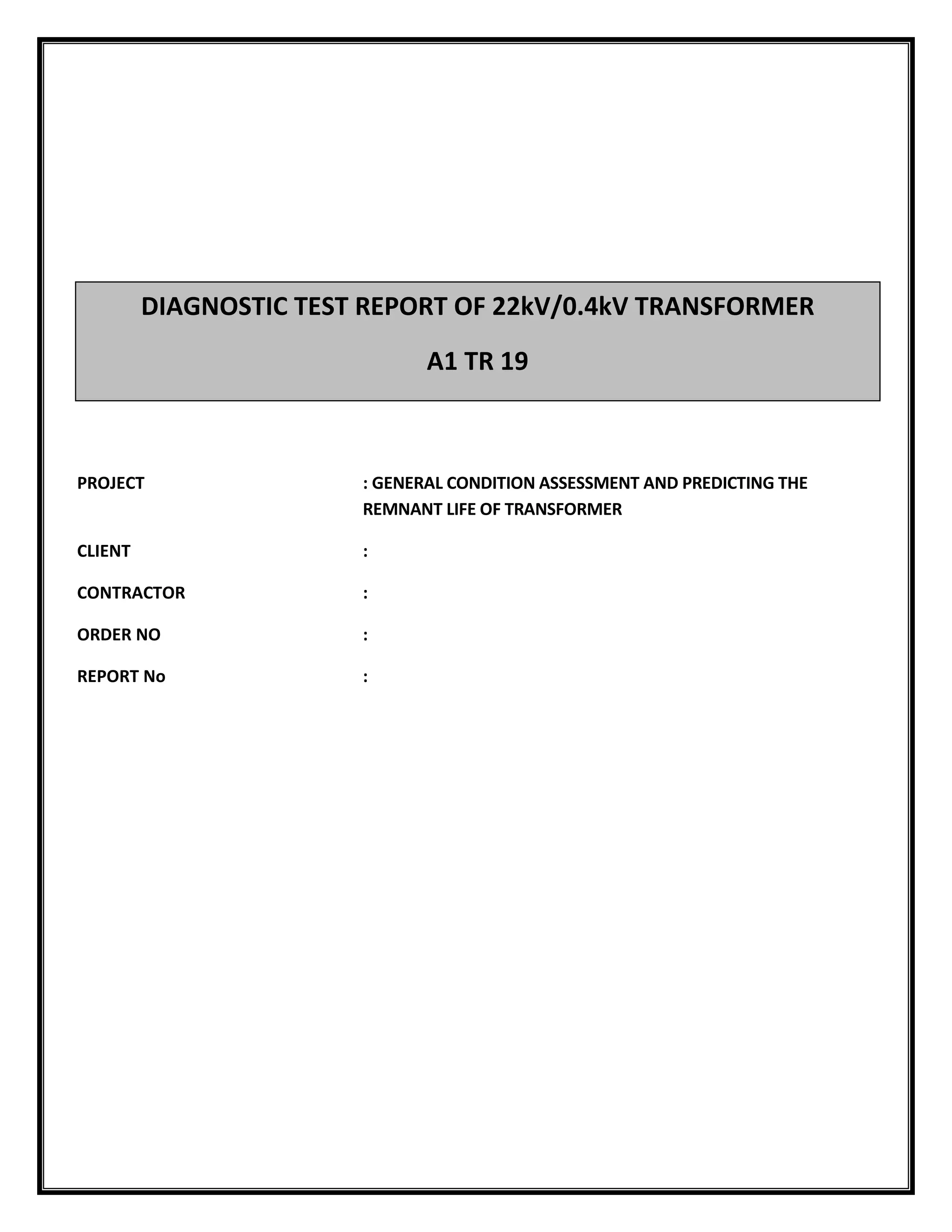 This document provides a diagnostic test report of a 22kV/0.4kV transformer. It includes the results of various tests performed on the transformer such as insulation resistance, magnetic balance, vector group, impedance, winding resistance, and SFRA tests. The document finds that the transformer is in critical condition based on dissolved gas, moisture content, and partial discharge analysis. It recommends taking the transformer out of service, performing oil filtration and retrofitting with new protections before putting it back in service.