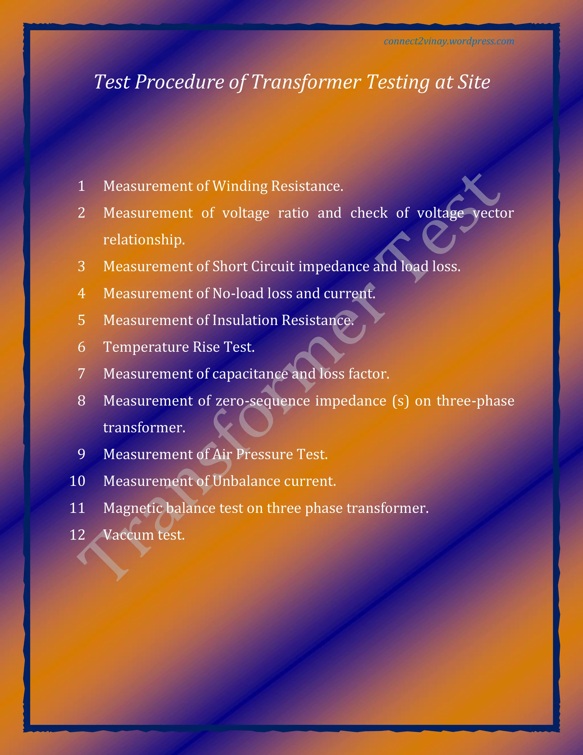 This document outlines 12 test procedures for testing transformers on site, including measuring winding resistance, voltage ratios, short circuit impedance, no-load loss and current, insulation resistance, temperature rise, capacitance and loss factor, zero-sequence impedance, air pressure, unbalance current, magnetic balance, and vacuum integrity.