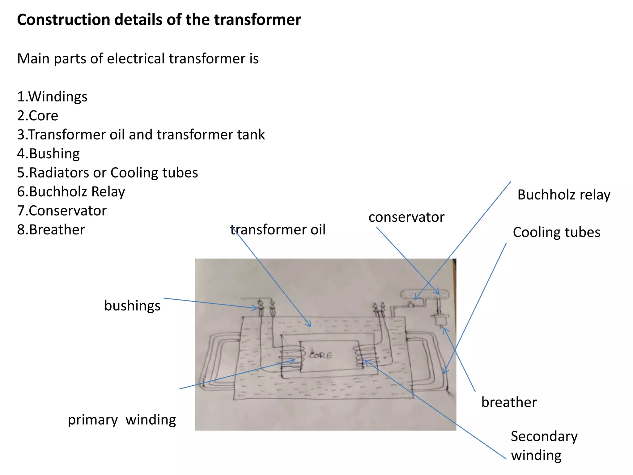 The document summarizes the main parts and construction details of a transformer. It describes the key components as the primary and secondary windings wound around the laminated silicon steel core, the transformer oil and tank that provide insulation and cooling, and protective devices like the Buchholz relay, conservator, and breather. It explains that the transformer works on the principles of electromagnetic induction and mutual induction to induce an alternating current in the secondary winding from the primary winding based on the alternating flux in the core.