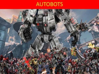 The document discusses the two groups of Transformers, the Autobots and Decepticons. Originally they lived peacefully on their planet Cybertron, but war broke out when the Decepticon leader Megatron wanted to rule Cybertron through tyranny. The Decepticons fought to establish Megatron's rule, while the Autobots fought for freedom and autonomy.