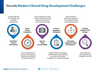 Leveraging IOT to transform clinical development and improve patient engagement. Creation of personalized patient centric trials by decoding modern clinical drug development challenges, identifying instances of trial non compliance, deploying smart IOT solutions, and finally establishing connected trials.