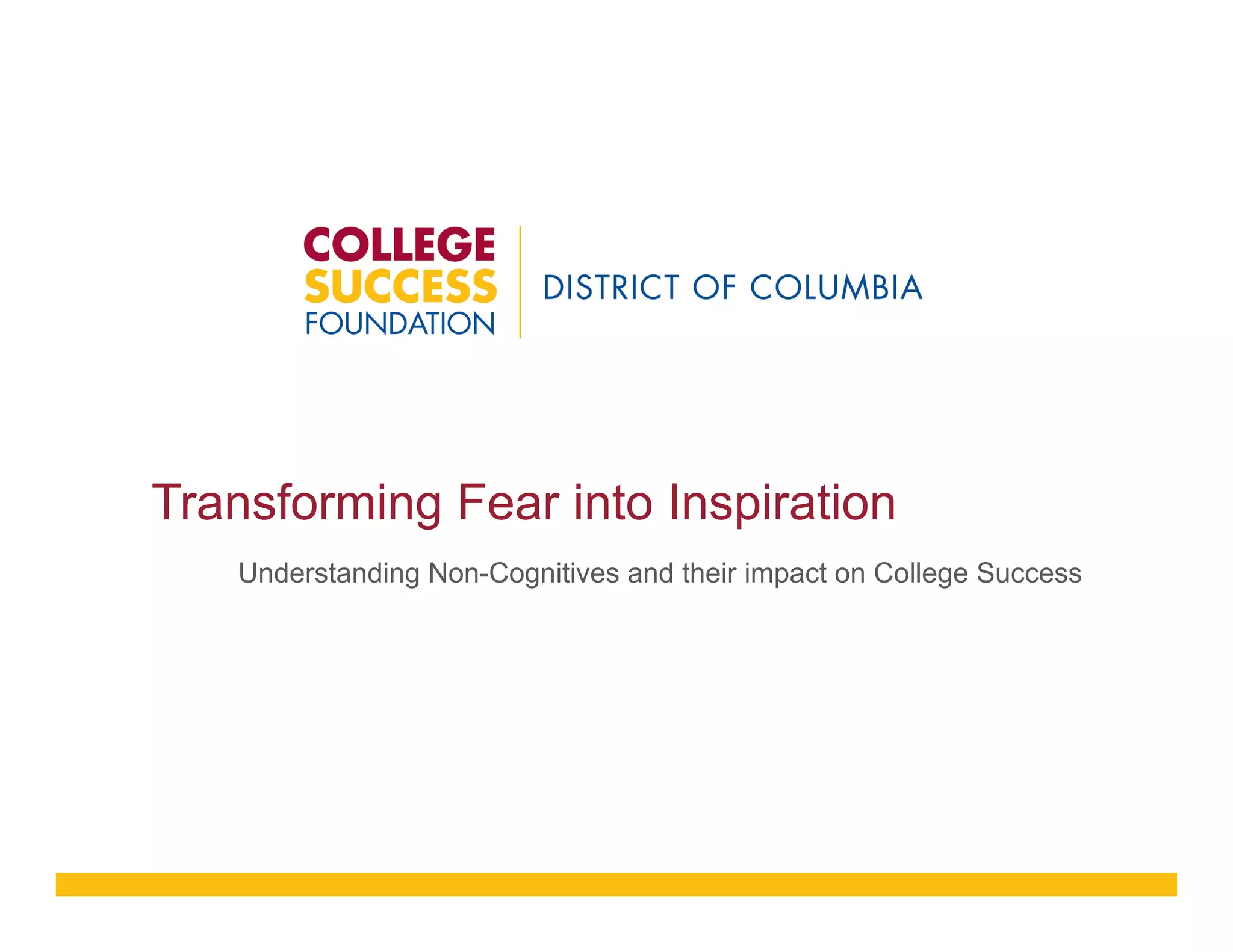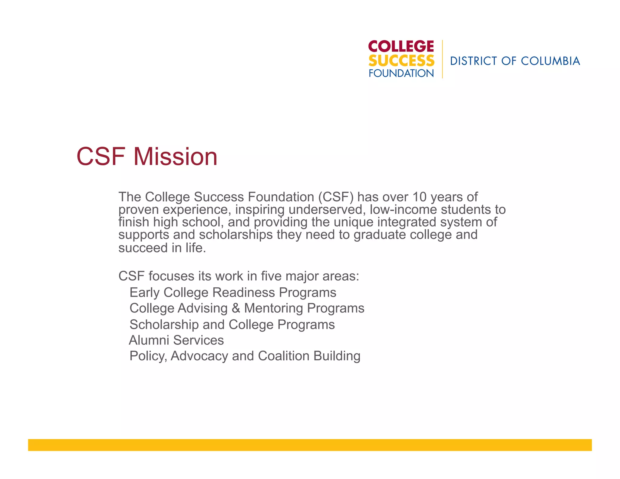The College Success Foundation (CSF) is a nonprofit organization that works to inspire underserved, low-income students in Washington D.C. to graduate from high school and complete college. It focuses on early college readiness programs, college advising, scholarships, alumni services, and advocacy. CSF's main programs are the Higher Education Readiness Opportunity program in 10 schools and the Achievers Scholar program in 6 east D.C. schools. These programs provide academic and social supports to help first-generation and underprepared students progress through high school and enroll in and complete college at high rates. Non-cognitive skills are also emphasized as important factors in college success.