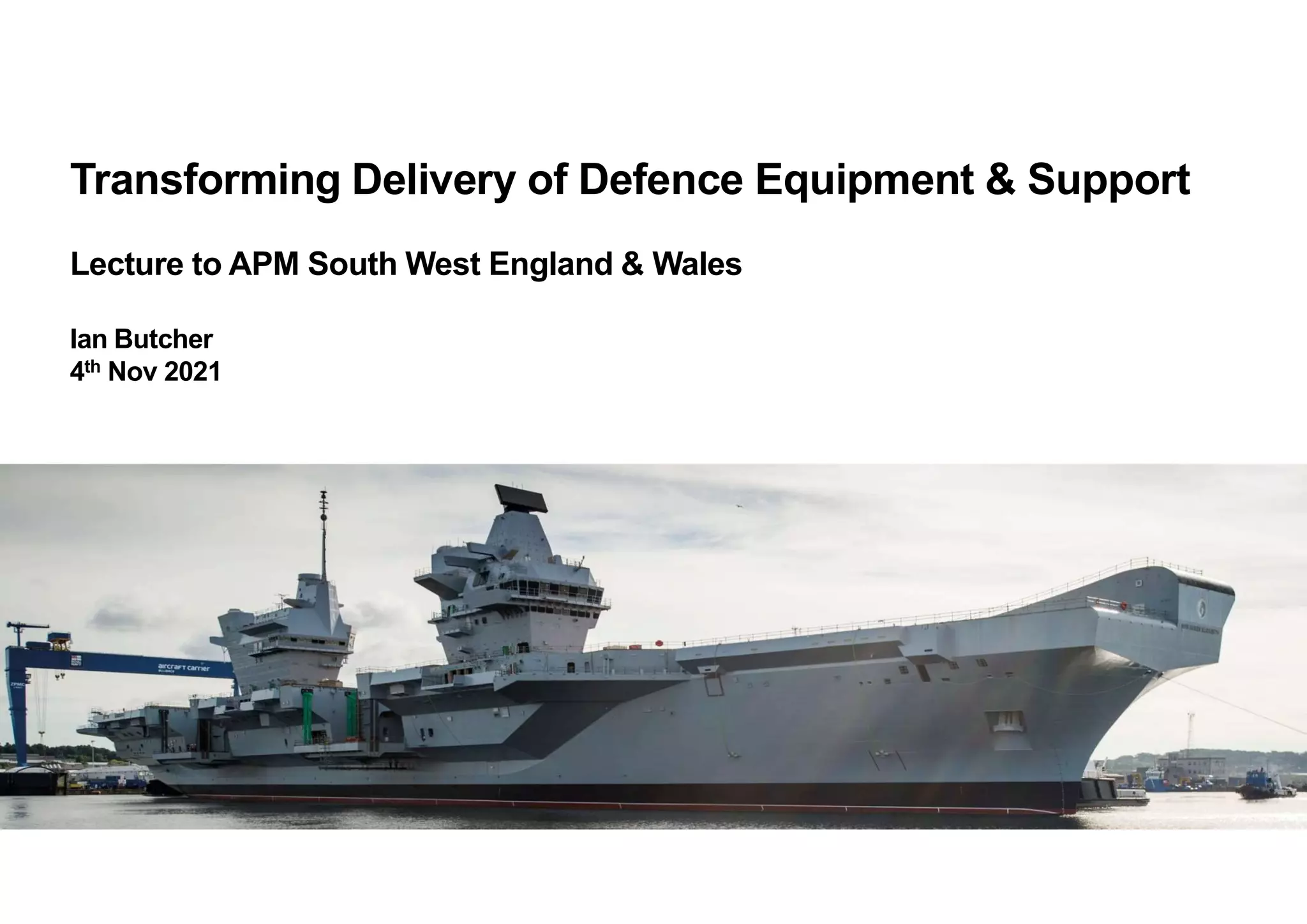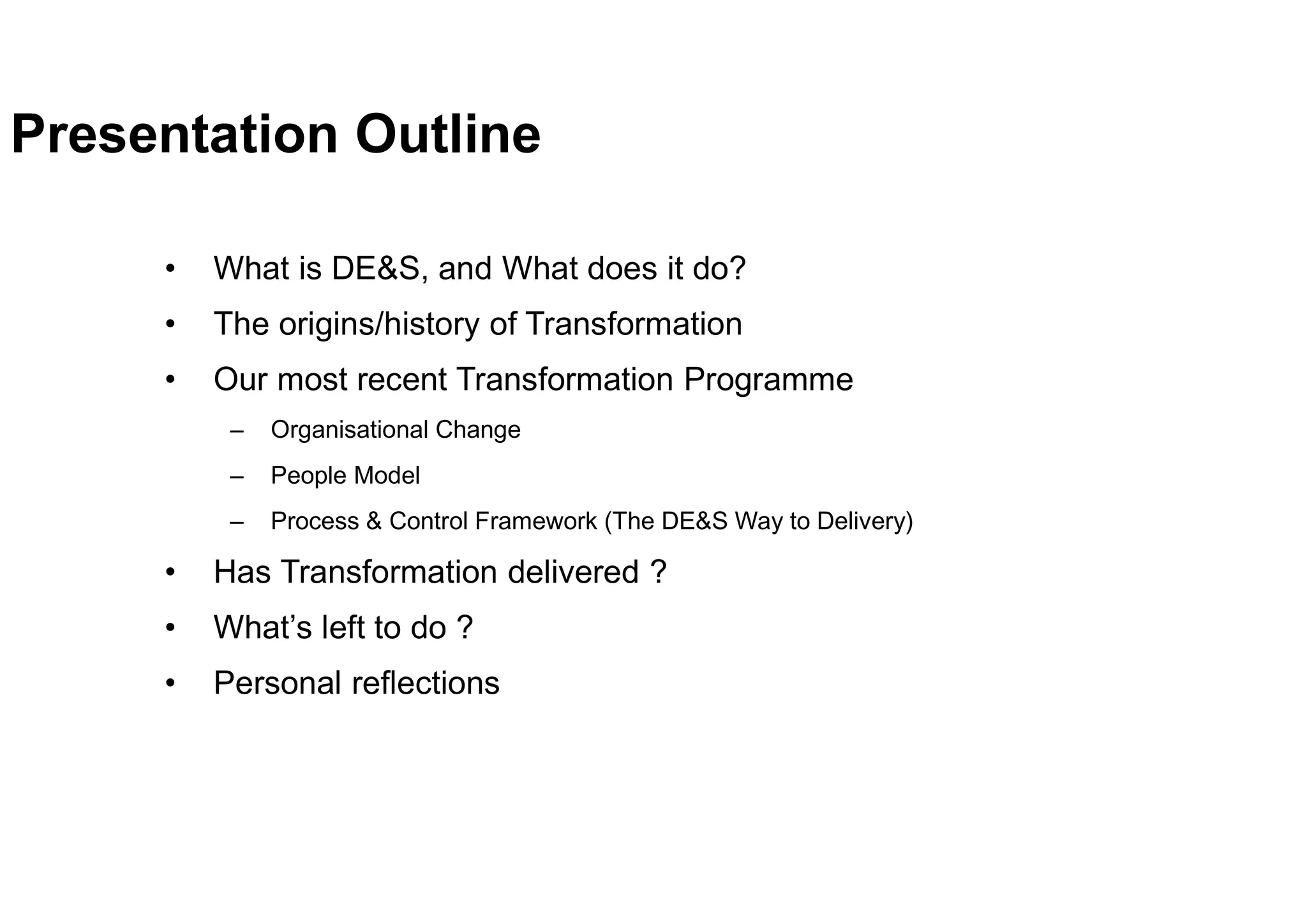 The presentation outlines the transformation journey of Defence Equipment & Support (DE&S), detailing its evolution into a bespoke trading entity managing significant defense projects for the UK armed forces. Key changes include organizational restructuring, improved people management practices, and enhanced process controls, all aimed at achieving a target of £3.44 billion in transformation benefits. Looking ahead, DE&S aims to adapt further by enhancing technology use, focusing on sustainability, and ensuring a well-managed workforce.