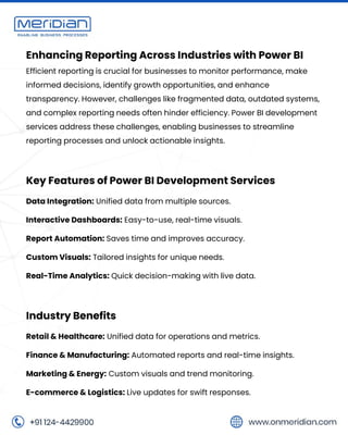 The document discusses how Power BI development services enhance reporting efficiency across various industries by addressing challenges like fragmented data and outdated systems. Key features include data integration, interactive dashboards, report automation, custom visuals, and real-time analytics, which help businesses make informed decisions. Meridian Solutions offers tailored Power BI implementations and ongoing support to empower businesses to leverage data effectively in a competitive environment.