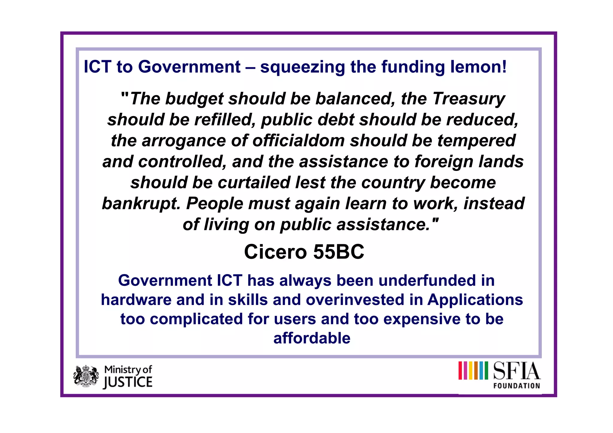 The document discusses challenges with government IT projects, including underfunding, lack of skills, and applications that are too complicated. It notes impatience from the industry due to consistent failures to deliver on time and budget. The document outlines what the Ministry of Justice is doing to address these issues, including assessing skills, reducing reliance on contractors, and taking a systematic approach to skills management. The key is balancing skills within project teams and improving communication between IT professionals and practitioners.