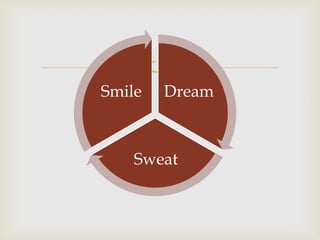 The document discusses three key aspects - Dream, Sweat, and Smile. Dreaming refers to envisioning the future and building at a mental level through focus and creativity. Sweating means working hard at a physical level by challenging limits and achieving goals through perseverance. Smiling represents being happy, relaxed and at peace at a heart level. The overall message encourages following one's dreams through hard work while also making sure to smile and enjoy life.
