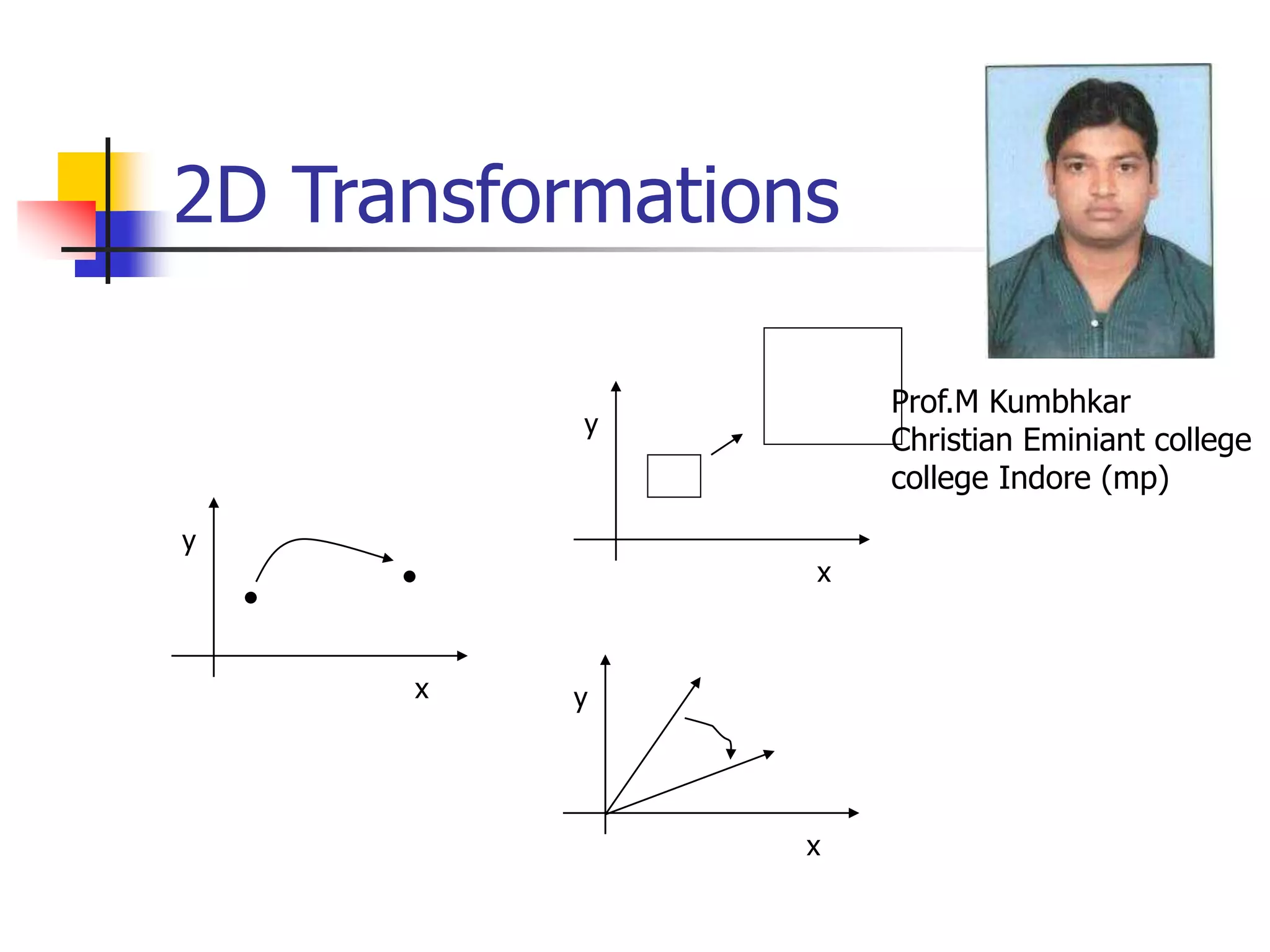 This document discusses various 2D transformations including translation, rotation, scaling, shearing, and their implementations using transformation matrices. Translation moves an object along a straight line and can be represented by a 3x3 matrix. Rotation rotates an object around a center point, with the standard rotation matrix rotating around the origin. Scaling changes the size of an object, which can cause undesirable movement. Shearing skews an object along an axis. The document also covers composing multiple transformations using matrix multiplication and how OpenGL applies transformations through a global model-view matrix.