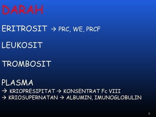 Dokumen tersebut membahas tentang transfusi darah dan reaksi transfusi. Terdapat beberapa komponen darah yang dapat ditransfusikan seperti eritrosit, leukosit, trombosit, dan plasma. Reaksi transfusi dapat terjadi secara imunologis maupun non-imunologis, dengan manifestasi yang bervariasi dari ringan hingga fatal. Pencegahan dan penatalaksanaan reaksi transfusi perlu dilakukan.