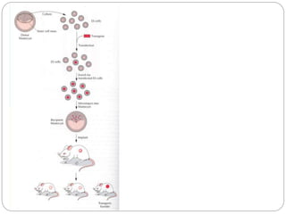 Transgenic animals are produced by artificially introducing genetic material from another species into the animal's genome. There are several methods used to create transgenic animals, including DNA microinjection, retrovirus-mediated gene transfer, and embryonic stem cell transfer. Examples of transgenic animals include mice, cows, pigs, monkeys, rabbits, and fish. Transgenic animals have applications in medicine, agriculture, and industry, such as producing human proteins for pharmaceuticals, creating disease models, and improving crop yields. However, there are also disadvantages like unintended effects on the animal's genes and low survival rates.