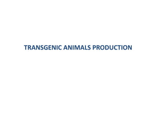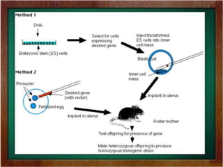 There are two main methods for creating transgenic animals: nuclear microinjection and using embryonic stem cells. Nuclear microinjection involves injecting a transgene into a fertilized egg before the pronuclei fuse, allowing for around a 5-40% success rate. Embryonic stem cells are derived from the blastocyst and can be engineered with a transgene before being inserted into an early embryo, resulting in a genetic chimera with some transgenic tissues. Retroviruses can also be used to infect embryonic stem cells and integrate a transgene into the genome.