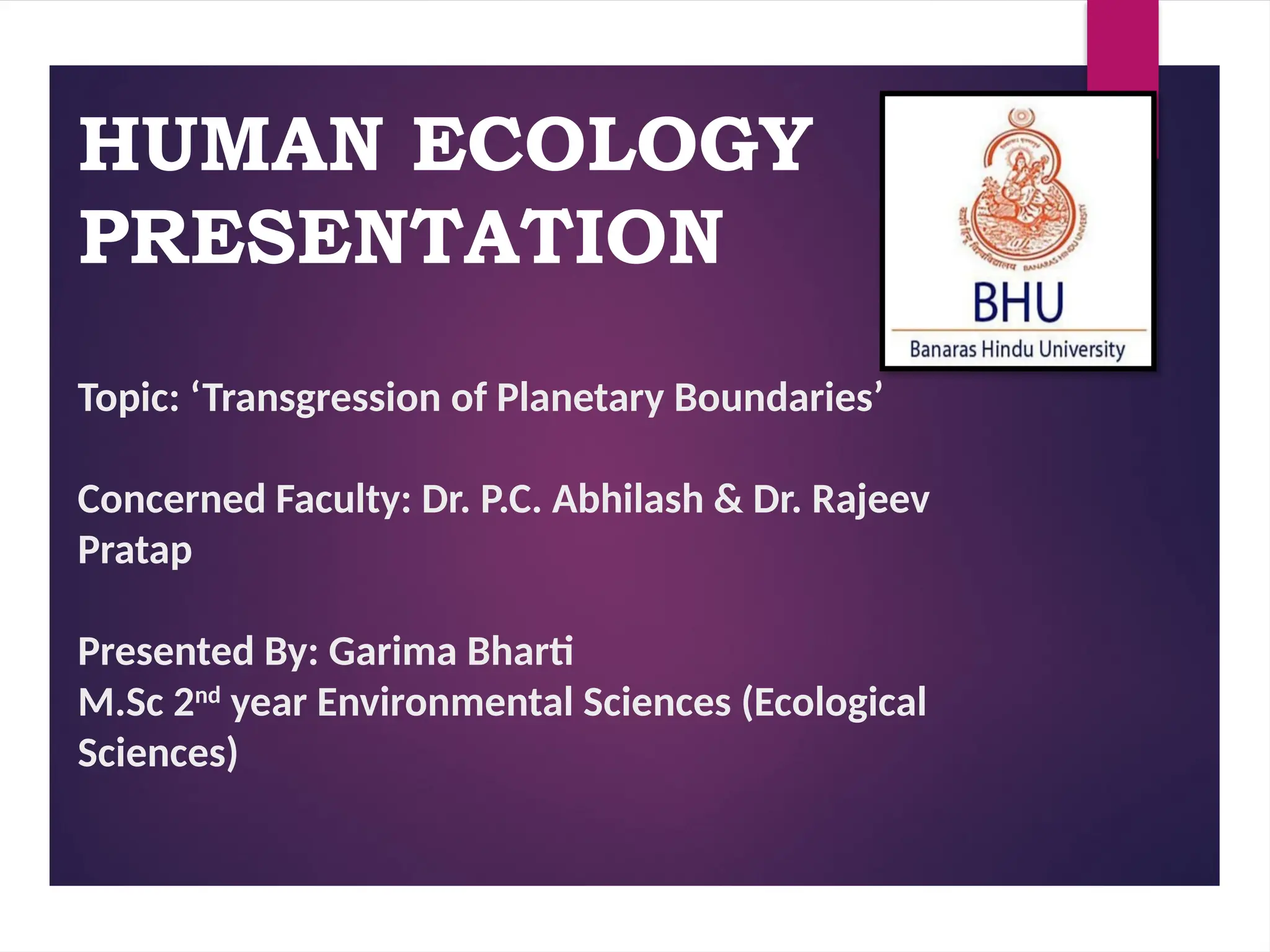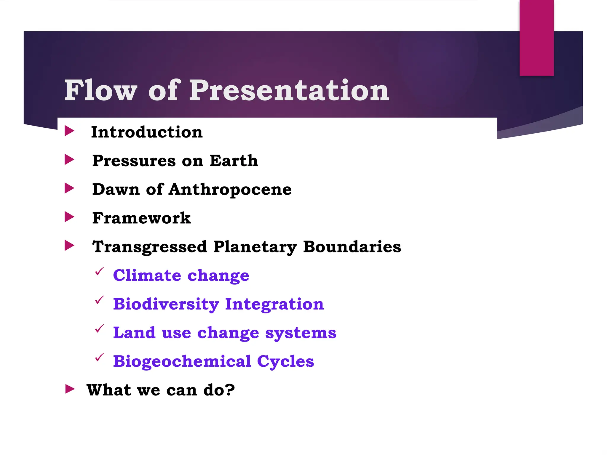 The document discusses the concept of 'transgression of planetary boundaries,' emphasizing the destabilization of Earth processes due to human activities like population growth and resource overconsumption. It outlines the framework introduced by Johan Rockström and Will Steffen, which identifies nine planetary boundaries, of which four are currently being transgressed, notably climate change and biodiversity loss. The document concludes with a call to action, stressing the need for a transformation in food systems and energy usage to prevent catastrophic environmental changes.