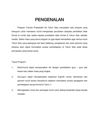 Program Transisi Prasekolah Ke Tahun Satu bertujuan membantu murid menyesuaikan diri dengan perubahan dari pendidikan tidak formal ke pendidikan formal di Tahun Satu. Program ini memastikan murid dapat memulai pembelajaran di Tahun Satu pada tingkat pencapaian yang hampir sama, terlepas dari latar belakang mereka.