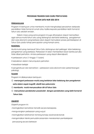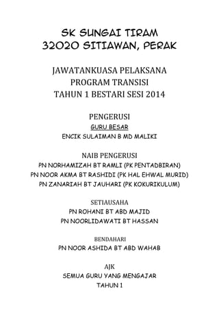 Dokumen tersebut merangkum program transisi tahun satu di SK Sungai Tiram yang bertujuan membantu pelajar menyesuaikan diri dari pendidikan pra-sekolah ke sekolah. Ia terdiri daripada tiga fasa selama tiga bulan dengan tema 'Minda Cerdas, Mata Bercahaya' dan meliputi aktiviti untuk menangani perbezaan pelajar serta membantu mereka menyesuaikan diri. Program ini dilaksanakan oleh jawatankuasa pelaksana yang terdi