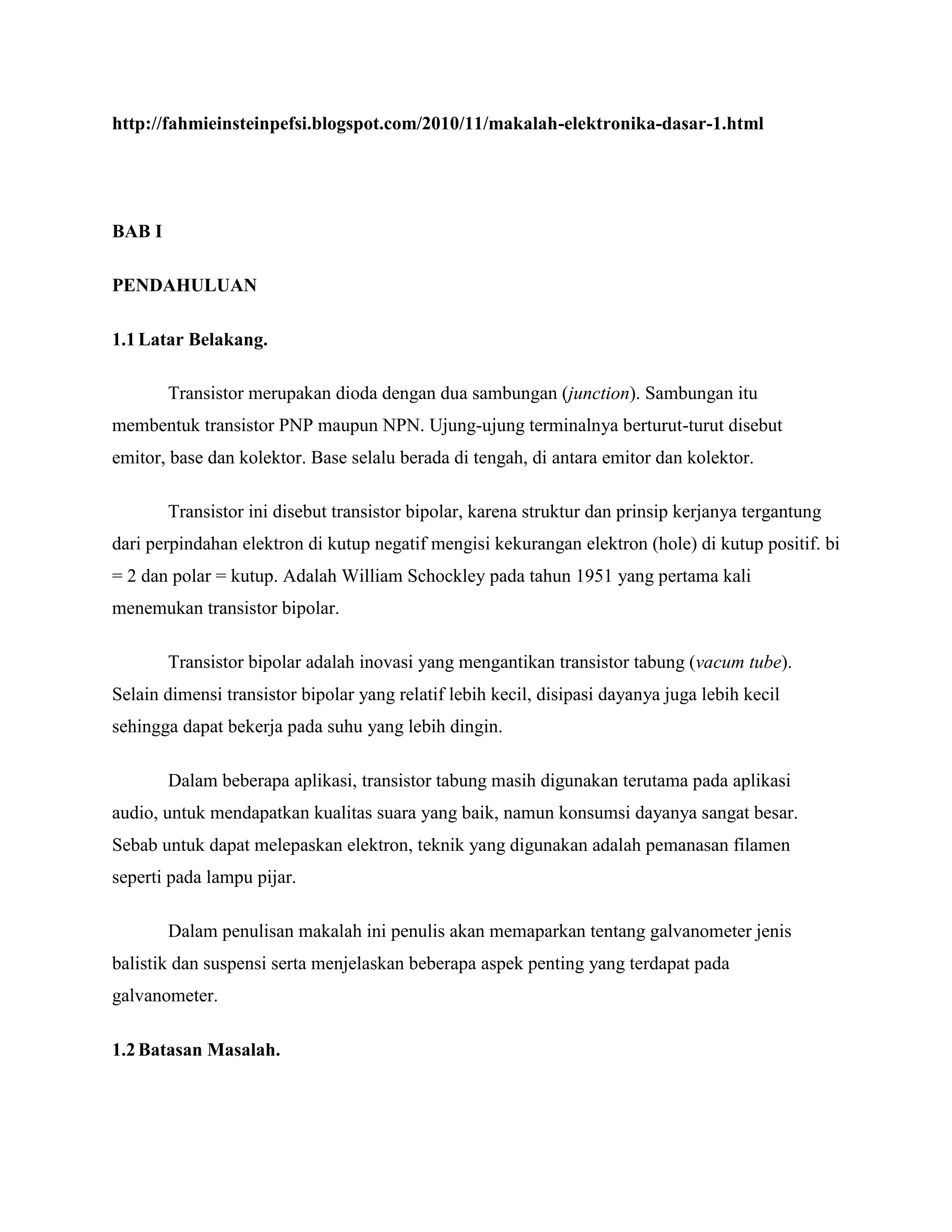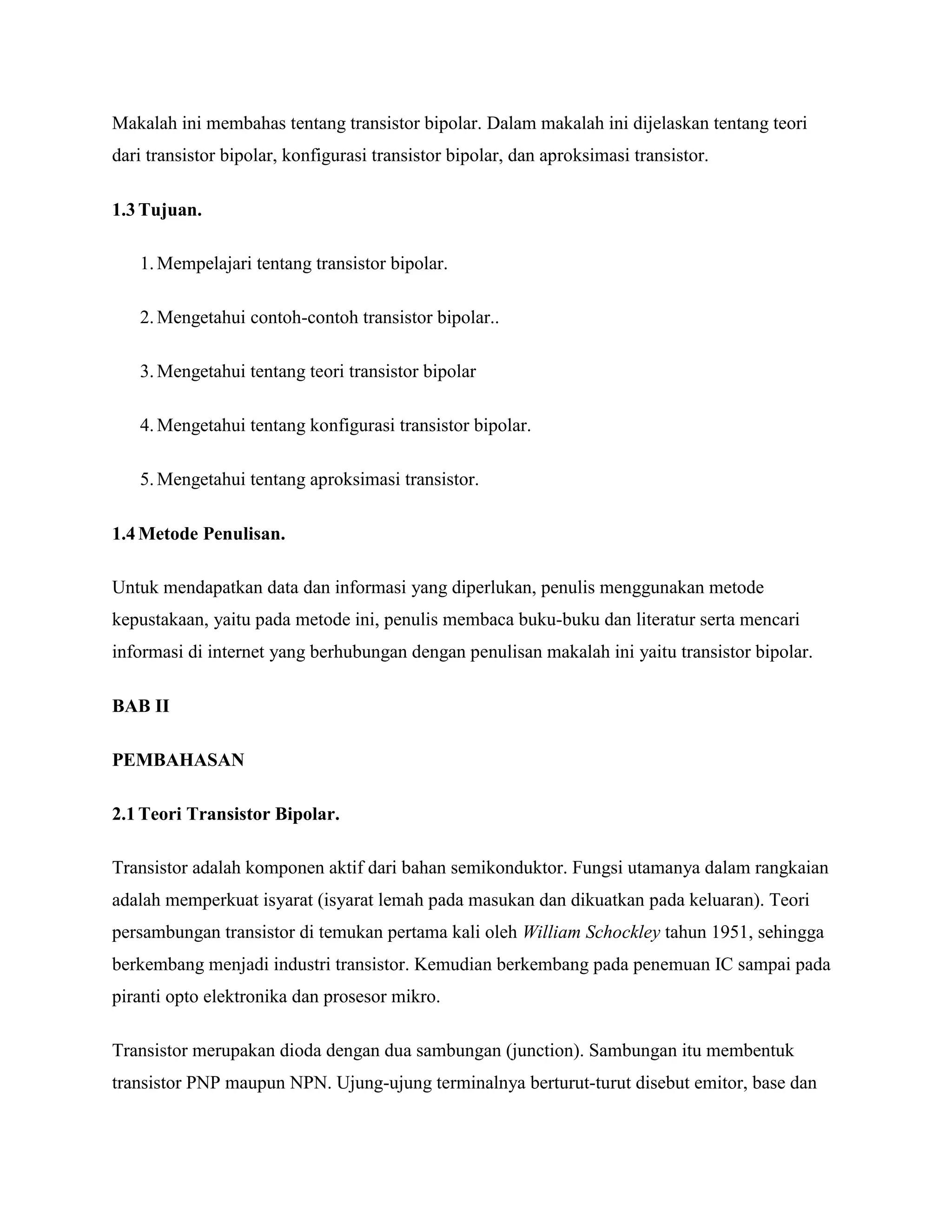 Dokumen ini membahas tentang transistor bipolar, termasuk teori, konfigurasi, dan aplikasinya. Transistor bipolar, yang ditemukan oleh William Shockley pada tahun 1951, menggantikan transistor tabung dengan dimensi yang lebih kecil dan daya disipasi yang rendah. Makalah ini juga mendalami cara kerja transistor dalam memperkuat sinyal dan berbagai konfigurasi seperti common base, common emitter, dan common collector.