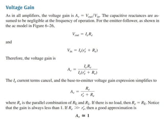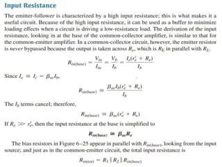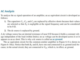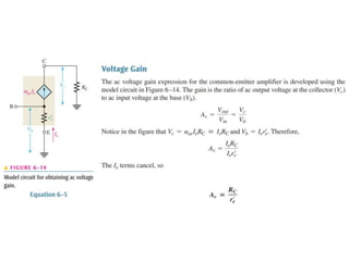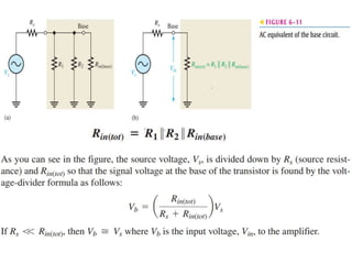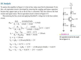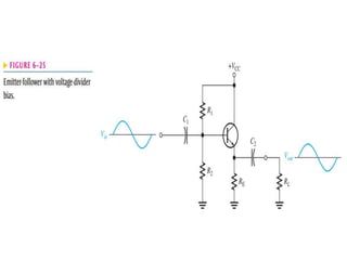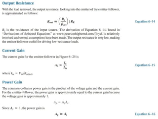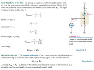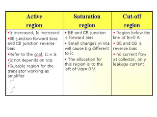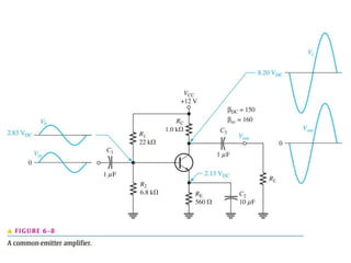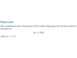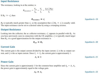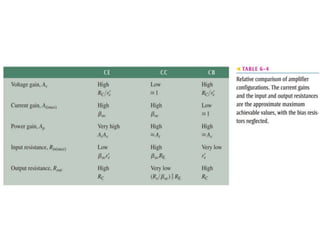 The document discusses different configurations of bipolar transistors in electronic circuits: common base, common emitter, and common collector. Each configuration has different characteristics in terms of current gain, voltage gain, power gain, input/output impedance, and phase reversal. The common base configuration has voltage gain but no current gain. The common emitter configuration has both current and voltage gain. The common collector configuration has current gain but no voltage gain.