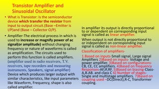 This document discusses transistor amplifiers. It defines a transistor and amplifier, and describes how transistors can be used to faithfully amplify signals without changing their frequency or shape through proper biasing. It covers transistor types (NPN and PNP), components of transistor circuits like the emitter, base, and collector, and classifications of amplifiers. It also explains phase reversal in common emitter amplifiers, drawing load lines to represent transistor behavior, and calculating DC and AC equivalent circuits to analyze amplifier operation.