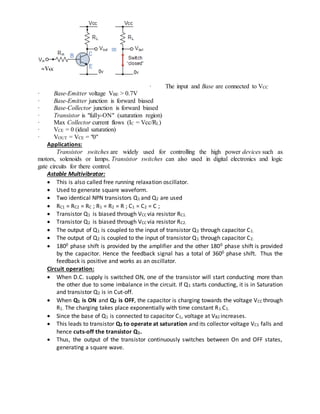 The document discusses the operation of transistors as switches, specifically in the saturation and cut-off regions, where they can control current flow. It also describes astable and bistable multivibrators, detailing how two transistors can generate square waveforms and maintain stable states based on external triggers. Additionally, it highlights various applications of these circuits in electronic systems, including control mechanisms and memory elements.