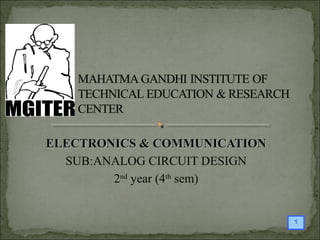 The document discusses analog circuit design and transistor behavior at high frequencies. It covers transistor models at high frequency, the Miller effect, amplifiers' frequency response, and practical considerations for using simplified transistor models. Diagrams are included showing high-frequency transistor equivalent circuits and how feedback impedances can be modeled as parallel impedances at the input and output terminals, known as the Miller approximation.