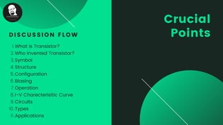 The document provides an overview of transistors, including their definition as semiconductor devices used for amplifying or switching signals and their invention in 1947. It details the structure, configuration types (common collector, common base, common emitter), and explains the biasing process necessary for optimal transistor performance. The document also mentions various applications of transistors in electronic circuits such as amplifiers and switching devices.