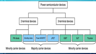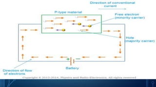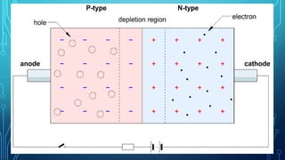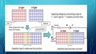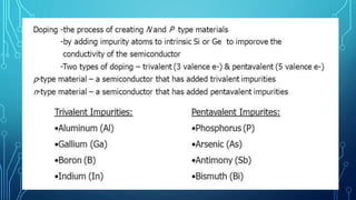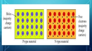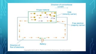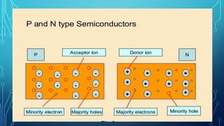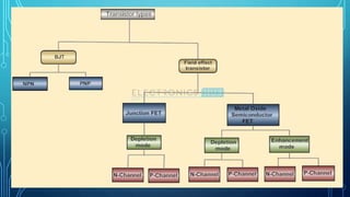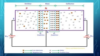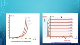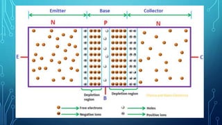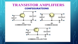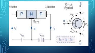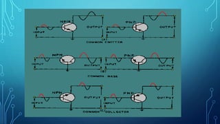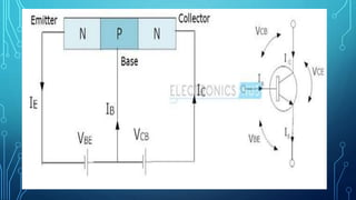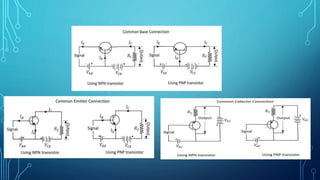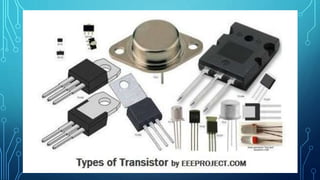 2. There are two types of transistors - NPN and PNP, defined by the doping of the semiconductor material. Transistors can be configured in common base, common emitter, or common collector modes.