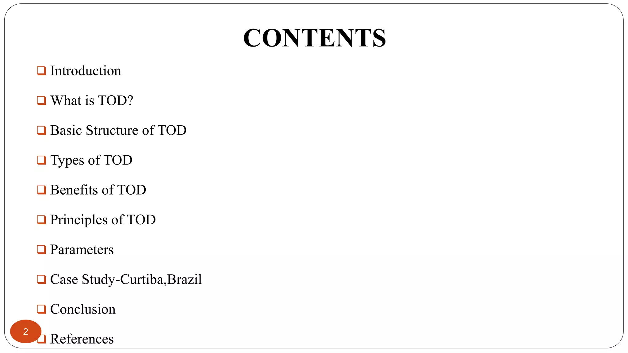 This graduate report presentation summarizes the concept of transit-oriented development (TOD). TOD aims to integrate land use and public transportation by concentrating mixed-use, walkable development around public transit stations to promote their use. The presentation defines TOD, describes its basic structure including a transit station, commercial core, offices, housing and open spaces. It outlines the types and benefits of TOD, principles for implementation, parameters to measure success, and provides an example of Curitiba, Brazil which significantly increased public transit ridership through TOD policies.