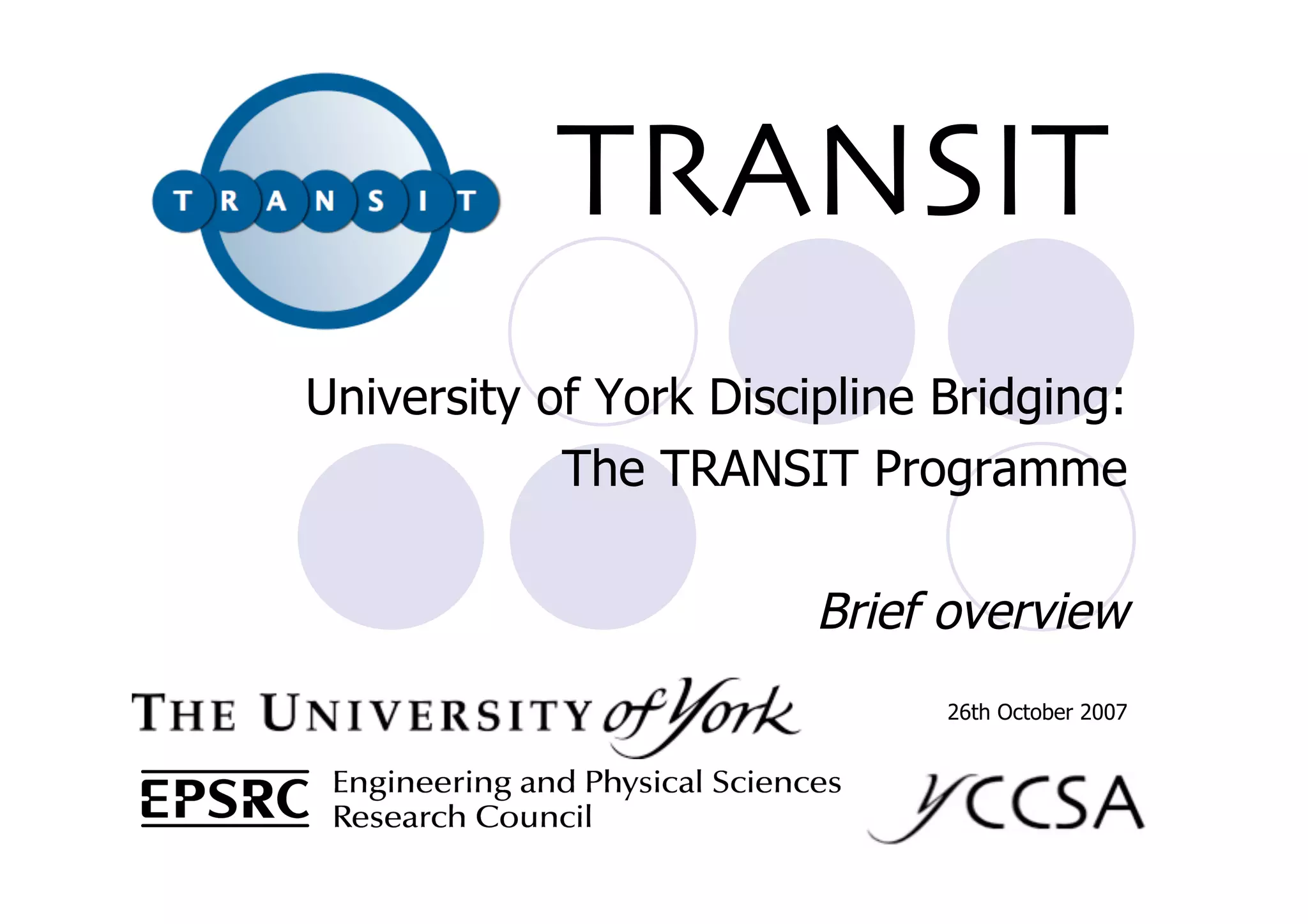 The document describes the TRANSIT program at the University of York, which aims to lower barriers to interdisciplinary research. The program will promote collaboration through seminars, visiting researchers, and funding for feasibility studies. It will also provide training in structured thinking techniques and establish a virtual platform to connect researchers across disciplines and advertise activities. The goal is to develop an interdisciplinary research community and foster more transdisciplinary approaches.