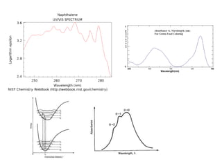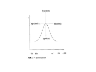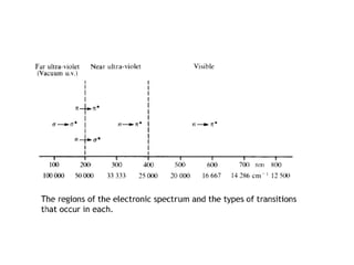 This document discusses electronic spectroscopy of transition metal complexes. It begins by explaining the different types of electronic transitions that can occur, including transitions involving p, s, n, d and f electrons. It then discusses absorption spectroscopy of species containing p, s and n electrons, as well as n→π* and π→π* transitions which are most common in organic compounds. The document also covers topics like orbital spin states, ligand field theory, effects of metal oxidation state and ligand identity on color, and how distortion of the octahedral geometry affects the d-orbital energies.