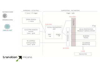 This document outlines plans for a Spark Session in Milan on March 11th 2014 to identify potential social innovators. The session will be hosted by Avanzi - Make a Cube and will include introductions, presentations from five keynote speakers, and discussions on opportunities for social innovation. Additionally, shorter Scouting Sessions will be organized in partnership with local organizations to engage more innovators. The goal is to gather ideas and applications to select 8-10 for intensive workshops to refine concepts and develop prototypes as part of scaling up the transition process.
