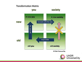 The document outlines a structured framework for facilitating transformation within organizations, emphasizing the importance of engagement, mutual learning, and systemic thinking. It details a transition process that includes stages such as mobilization, creation of action teams, and assessment of outcomes across multiple dimensions. Key components of fostering emergence involve building diverse groups, activating resources, and a commitment to shared values in relation to the common good.
