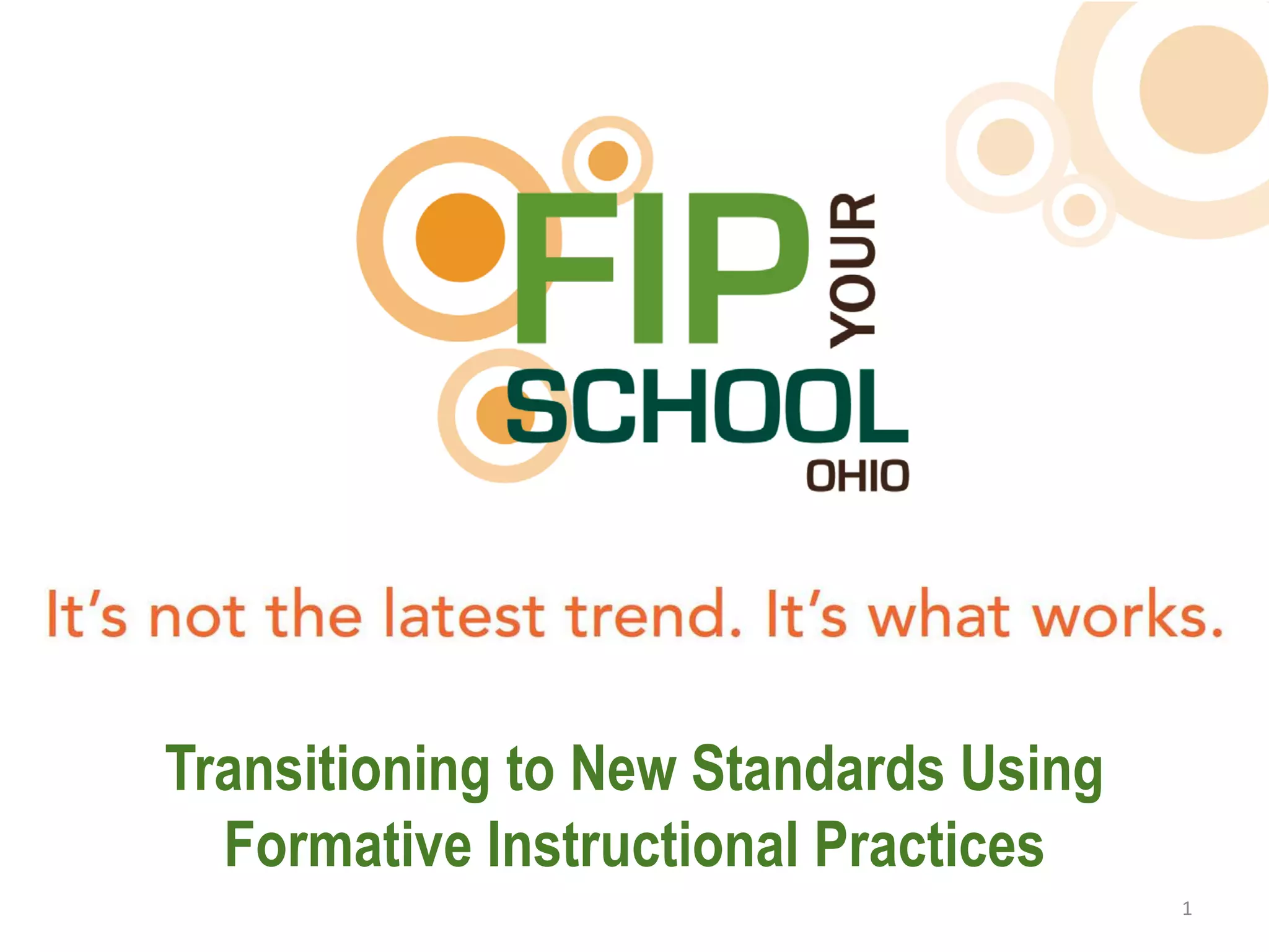 The document outlines the significance of formative instructional practices (FIP) in transitioning to new educational standards, particularly the Common Core State Standards. It details core components of FIP, such as clear learning targets, evidence collection, and feedback mechanisms, while emphasizing their role in supporting student ownership of learning. Additionally, it suggests actionable steps for districts to ensure effective implementation of these practices and the revised standards.