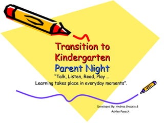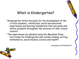 This document provides information for parents about kindergarten in Prince George's County Public Schools. It discusses what kindergarten is, where children will attend, the structure of a typical day, the curriculum and assessments used. It outlines the seven domains of the Maryland Model for School Readiness assessment. The document also discusses grading, report cards, and how parents can get involved at their child's school.