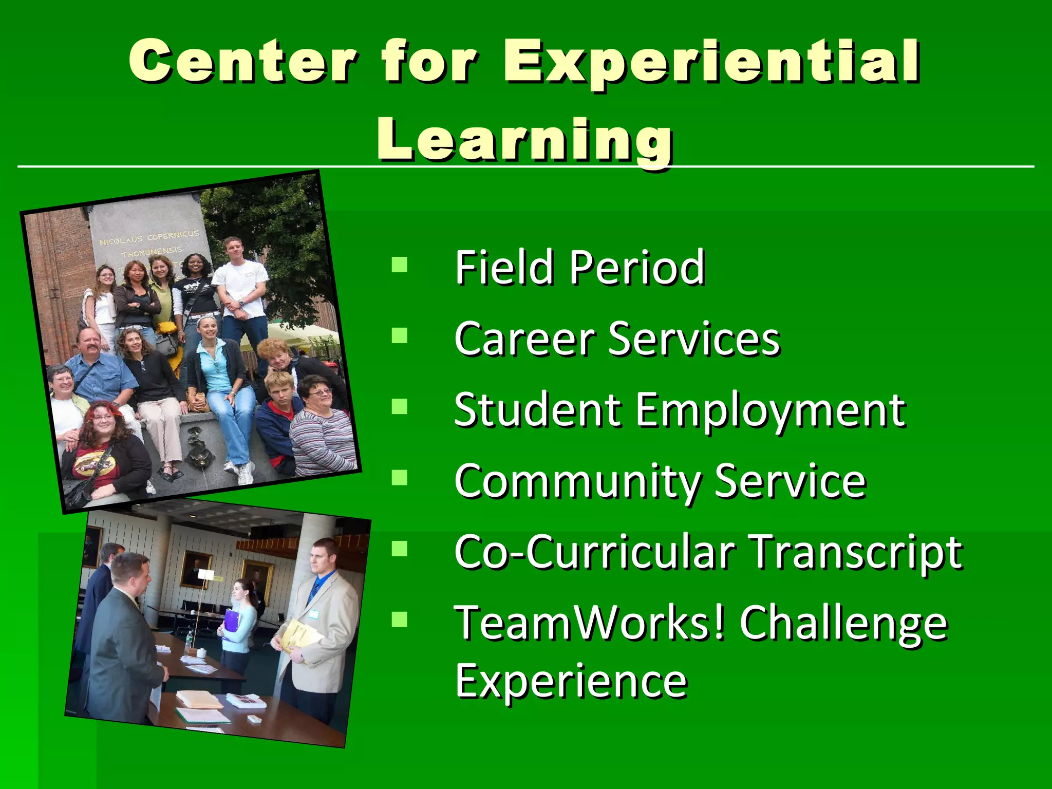 The document provides information about various career services, resources, and opportunities available to students at Keuka College including field periods/internships, career counseling, student employment, community service, co-curricular involvement tracking, leadership development programs, and the online job posting database Storm Tracker. It also includes guidelines for creating resumes to upload into Storm Tracker and lists the majors offered at Keuka College.