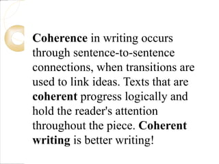 This document discusses the use of transition words and phrases to improve coherence and flow in writing. It provides examples of different types of transitions words that can be used, including time and location transitions, transitions that clarify or compare/contrast ideas, and transitions that sum up or conclude. Using transitions effectively helps writing progress logically and keeps the reader's attention by connecting one idea to the next.