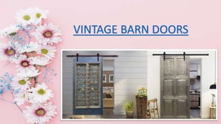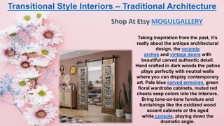 The document discusses antique architectural design elements such as veranda arches and vintage doors with intricate carvings. It highlights the use of dark woods, neutral walls for contemporary art display, and the incorporation of pastel colors in furniture, creating a tone-on-tone aesthetic. The overall theme revolves around transitional style interiors, blending traditional architecture with modern furnishings.