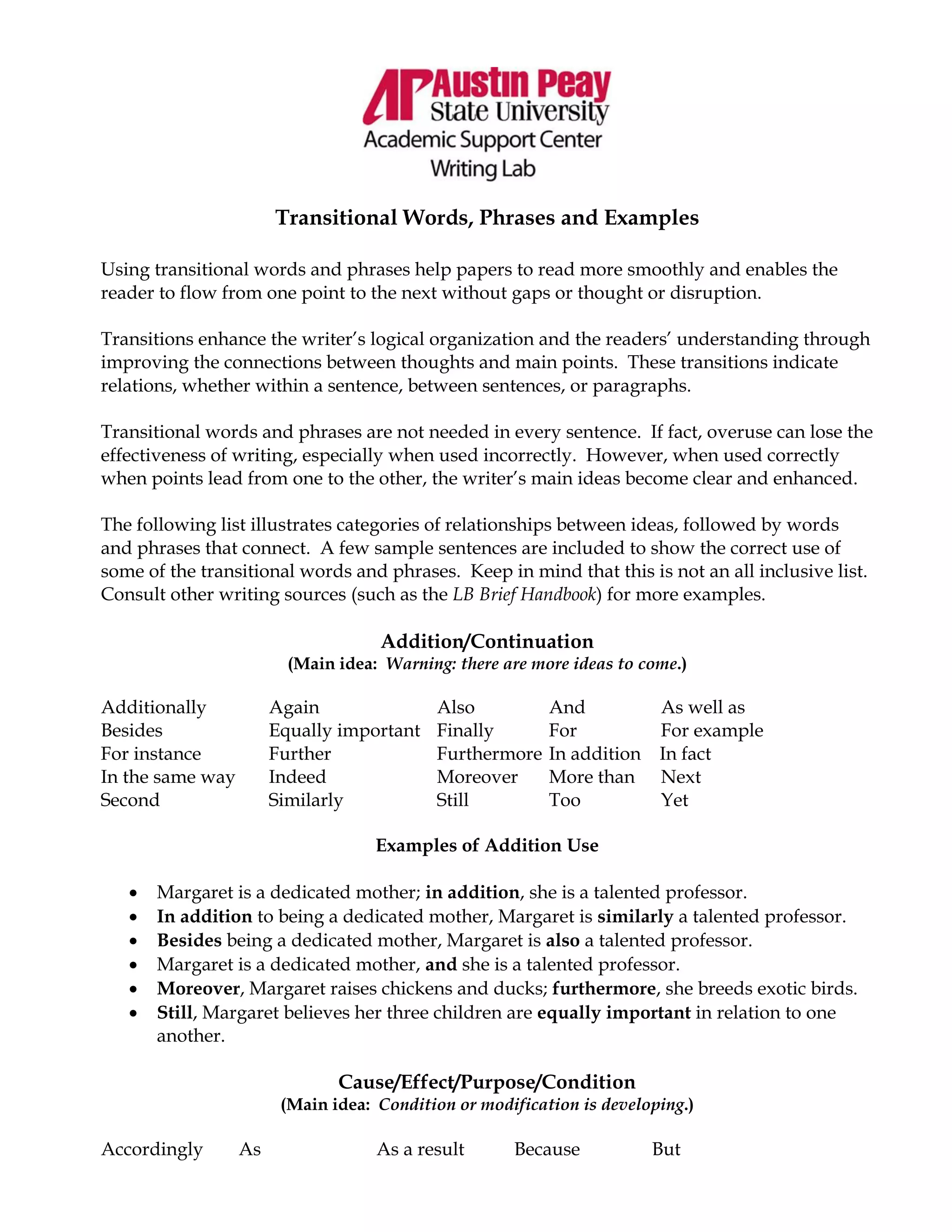 Transitional words and phrases help writing flow smoothly by improving connections between ideas. They indicate relationships within and between sentences and paragraphs. While not needed in every sentence, they clarify the progression of main points when used correctly. Examples are provided of transitional words and phrases for addition, cause/effect, comparison, contrast, concession, emphasis, and example/illustration.