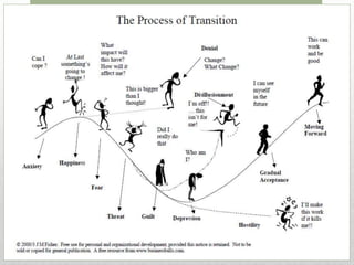 Transition coaching provides services to help individuals smoothly transition between roles in their careers, social lives, or parenting duties. The coaching identifies goals and strategies, helps channel fears into accomplishment, and utilizes strengths to find solutions faster than trying to transition without assistance. Sessions use models based on neuroscience and focus on setting clear expectations for return on the individual's investment in the coaching.