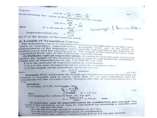 This document discusses transition curves, which are curves used to gradually change a roadway from a straight alignment to a circular curve. This allows vehicles to smoothly negotiate the curve without sudden shifts in centrifugal force. Transition curves decrease the radius gradually from infinity to the curve radius. They also provide a gradual increase in superelevation or banking from 0 to the level needed for the circular curve. Common transition curve types include spiral curves and parabolic curves. The length of a transition curve depends on factors like design speed, curve radius, and the rate of superelevation introduction. Formulas are provided to calculate superelevation and transition curve length for road design. Examples are included to demonstrate using the formulas.